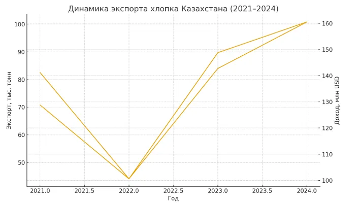Тем не менее, если смотреть на статистику последних лет, отрасль демонстрирует устойчивый рост. В 2021 году Казахстан экспортировал 70,8 тысяч тонн хлопка, в 2023 году – уже 84 тысяч тонн, а 2024 год стал рекордным – 100,8 тысяч тонн.
