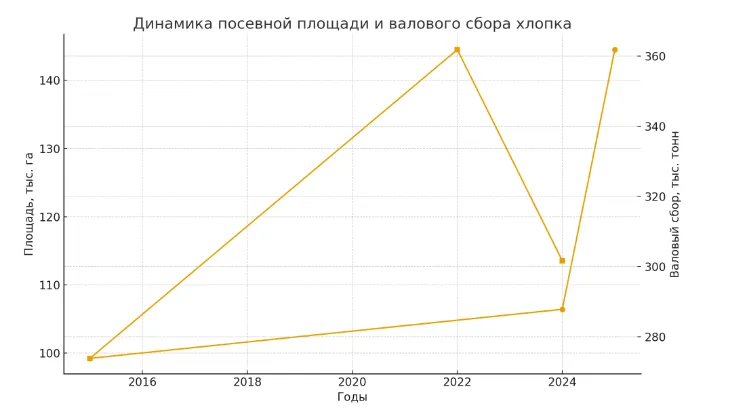 При этом за последние годы в хлопководстве наблюдают устойчивый рост. Если в 2015 году посевная площадь составляла 99,2 тысяч га, то к 2024 году она увеличилась до 106,4 тысяч га – рост на 7%. В 2025 году зафиксировали крупнейшее расширение отрасли за десятилетие.