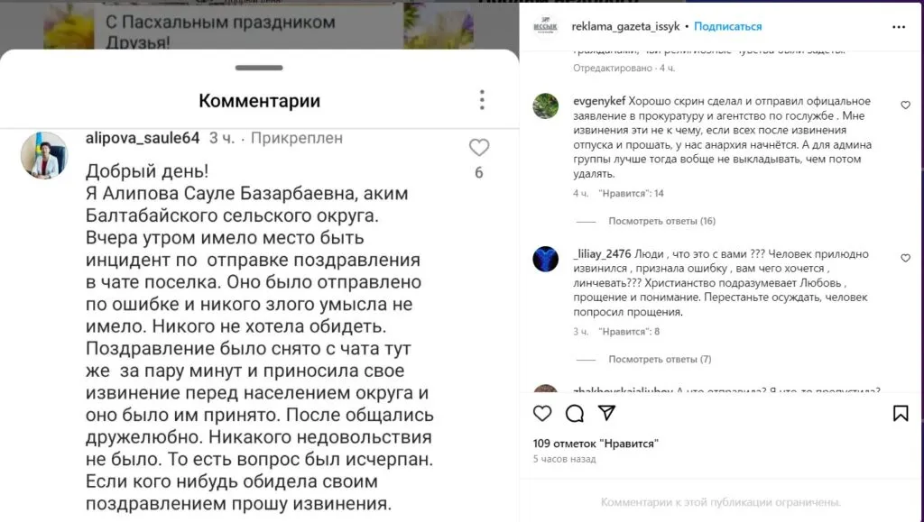 Спустя сутки в Instagram газеты «Иссык» появилось сообщение с извинениями, написанное с, предположительно, аккаунта акима. Исходя из него, автор поздравления не хотела кого-либо обидеть, а само фото отправила по ошибке.