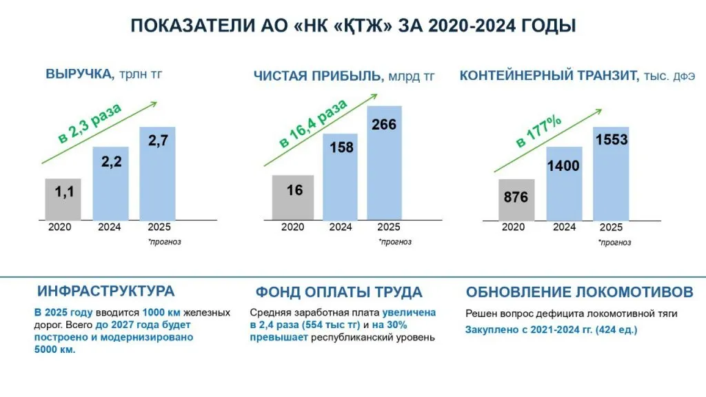 "За прошедшие годы компания прошла через масштабные преобразования и уверенно продвигалась к новым рубежам. Этот период ознаменовался ростом производственных и финансовых показателей, реализацией крупных инфраструктурных проектов и цифровой трансформацией отрасли", – сообщили в пресс-службе КТЖ.
