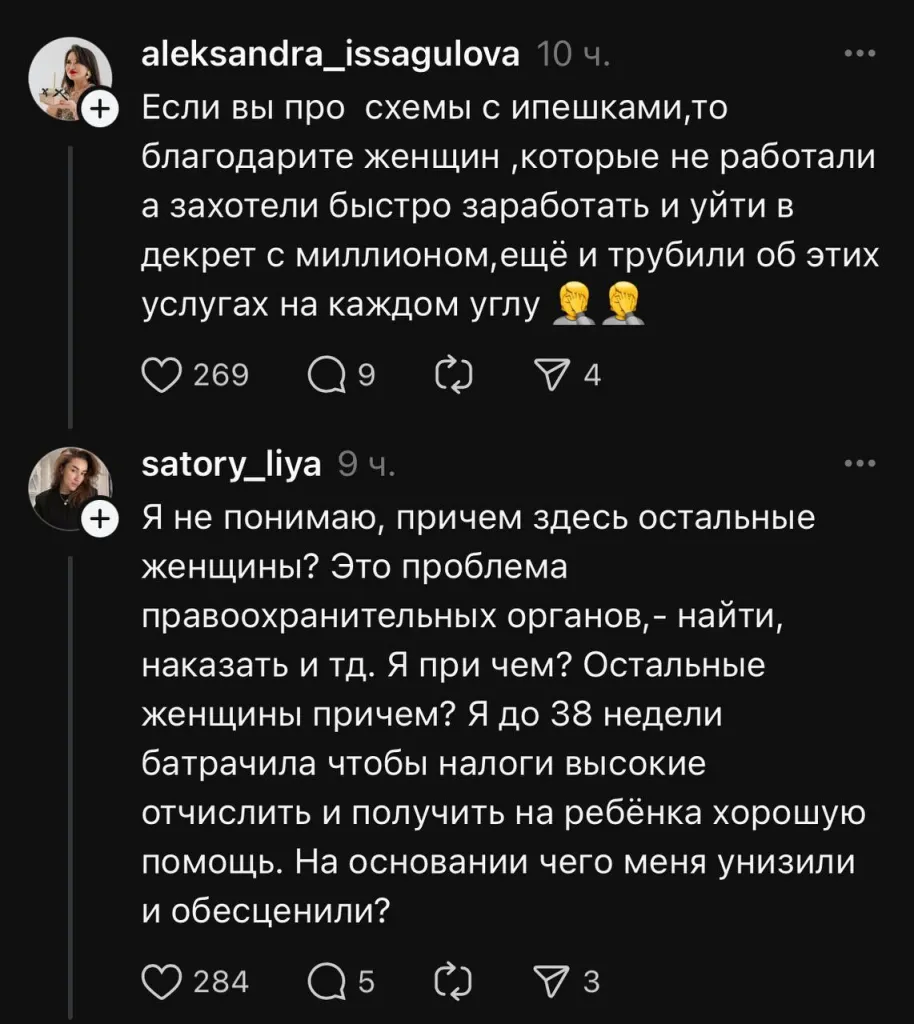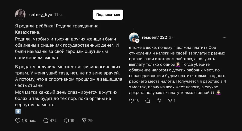 «Я родила ребёнка, гражданина Казахстана. Родила, чтобы я и тысячи других женщин оказались обвинёнными в хищении государственных средств. Нас наказали за наш героизм значительным снижением выплат. Уважаемое правительство, как вы посмели унизить тех, кто создаёт жизни, работая при этом на страну, оплачивая налоги и улучшая вам демографию? Пусть там наверху выявляют мошенниц и наказывают. Другие женщины при чём вообще? Я работала и платила честно. Почему я тоже вынуждена это принять на себя?», — пишет пользовательница в Threads.