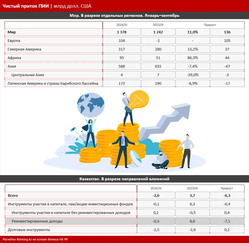 "Согласно отчётам Нацбанка РК, чистый приток прямых иностранных инвестиций в 2024 году составил минус 2,6 млрд долларов, то есть превратился в отток, в то время как в 2023-м этот показатель выглядел куда более оптимистично: 3,7 млрд долларов", – уточняют аналитики.