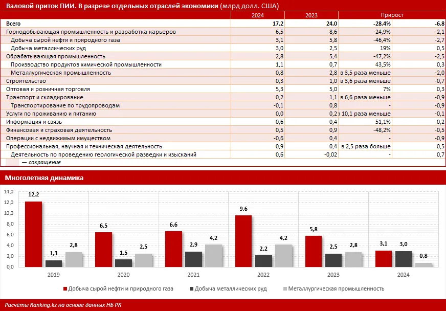 В 11 из 16 отраслей экономики РК по итогам 2024 года наблюдалась отрицательная динамика валового притока прямых иностранных инвестиций. Наибольшее влияние на ситуацию оказали две из них — добыча сырой нефти и природного газа, где показатель составил всего 6,5 млрд долларов (минус 2,1 млрд к 2023 году) и металлургическая промышленность, где инвестиции за год сократились на 2 млрд долларов, или в 3,5 раза.
