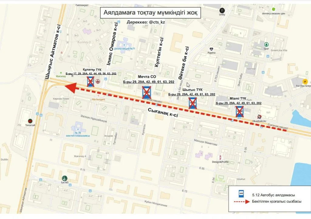 Как уточнили в ТОО «City Transportation Systems», проезд перекрыт к остановочным пунктам: «ЖК Miami», «ЖК Шығыс», «БЦ Мечта», «ЖК Кулагер» по улице Сыганак.