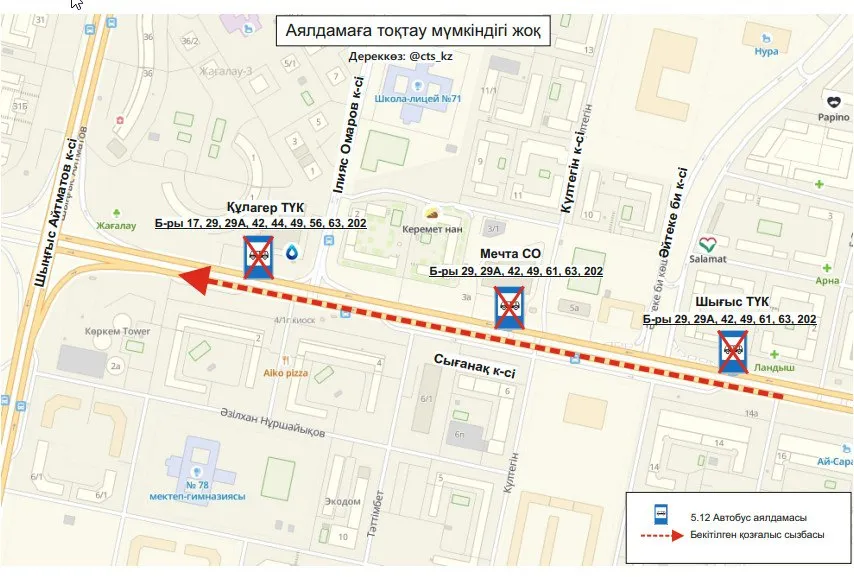 Как уточнили в ТОО «City Transportation Systems», проезд перекрыт к остановочным пунктам "ЖК Шығыс", "БЦ Мечта", "ЖК Кулагер" по улице Сыганак.