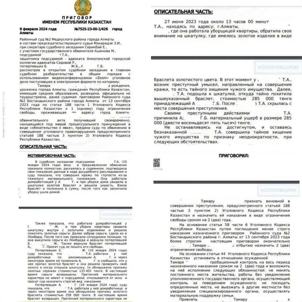 Отметим, что позже журналист CMN.KZ, уже не скрывая род своей деятельности, перезвонил жертве воровки. Однако женщина, узнав, что говорит с репортёром, наотрез запретила публиковать ее фамилию, несмотря на то, что информация об инциденте была взята из открытых источников. Редакция пошла на встречу женщине и не упоминает по её просьбе её анкетные данные. Для объективности мы публикуем приговор суда, в котором мы замазали персональную информацию и адрес проживания потерпевшей стороны.