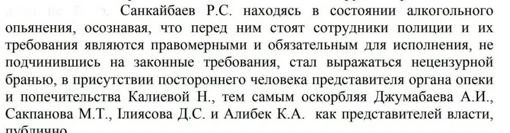 «Когда полиция прибыла, Санкайбаев находясь в состоянии алкогольного опьянения стал выражаться нецензурной бранью в адрес Джумабаева А.И. и Сакпанова М.Т. А поскольку дома находились несовершеннолетние дети, участковый инспектор вызвал инспектора по делам несовершеннолетних Илиясова Д.С. Который приехал на место с участковым инспектором Алибек К. и сотрудником органа опеки и попечительства Калиевой Н.», — сказано в судебных документах.