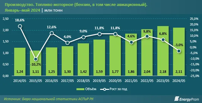 Производство бензина, в том числе — авиационного, с января по май составило 2,11 млн тонн. Это на 3% меньше, чем за аналогичный период 2023 года, передаёт CMN.KZ со ссылкой на Еnergyprom.kz