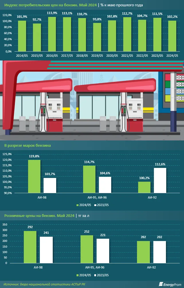 Средняя розничная стоимость бензина марки АИ-92 в городах Казахстана на конец мая составила 202 тенге за литр, АИ-95/96 — 252 тенге, АИ-98 — 292 тенге.