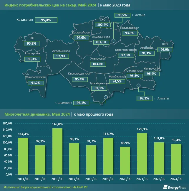 Что касается регионов, то цены на сахар за год выросли лишь в трёх областях: Улытауской (на 3%), Северо-Казахстанской (на 2,4%) и Акмолинской (на 1,1%).