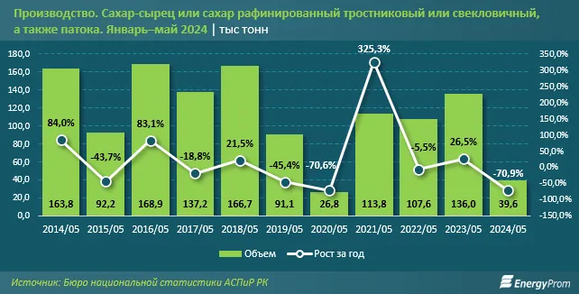 Эксперты подсчитали, что объём производства тростникового или свекловичного сахара-сырца или рафинированного сахара, а также патоки с января по май составил лишь 39,6 тыс. тонн. Это самый низкий показатель за последние четыре года. Аналитики пояснили, что хуже с производством сахара было только в «ковидном» 2020 году.