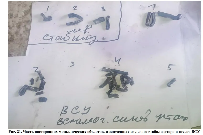 "Сквозные повреждения в отсеке гидросистем и механизма управления стабилизатором указывают на проникновения внешних объектов в конструкцию ВС", - говорится в документе.