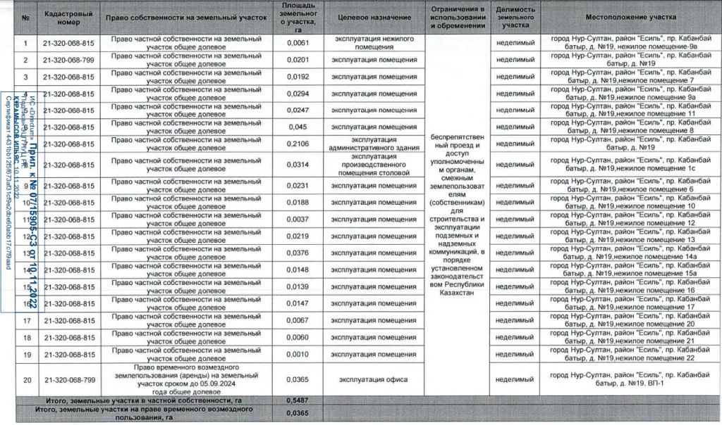 К офисам прилагались ещё и земельные участки. Общая площадь частной собственности составила 0,5487 га, а временного пользования – 0,0365 га. Из информации об участках, предоставленных оценщикам, следует, что "КазМунайГазу" на январь прошлого года принадлежали следующие земли с нежилыми помещениями по проспекту Кабанбай батыра, дом 19: 1С, 6, 7, 8, 9А, 9В, 11, 10, 12, 13, 14А, 15А, 16, 17, 20, 21 и 22.