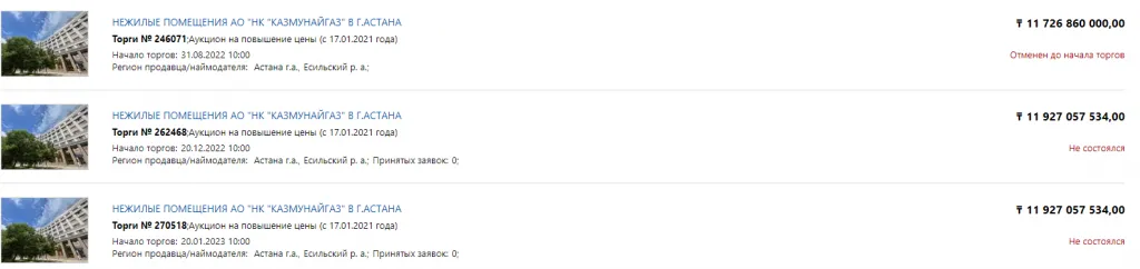Оказалось, "КазМунайГаз" не в первый раз выставляет на торги помещения. Более того, нацкомпании принадлежит гораздо больше, чем три этажа в двух блоках. С августа 2022 года АО три раза выставляло актив на реализацию в одни руки. Стоимость помещений в чиновничьем доме пытались продать один раз за 11,7 млрд тенге и два раза за 11,9 млрд тенге. Последний раз лот выставляли в январе 2023 года.