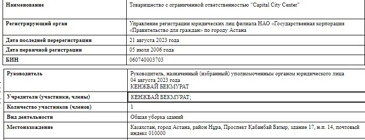 Владельцами Capital City Center на момент заключения контракта было ТОО "CaspianEnergy" и Денис Засадский. За последние четыре года учредители сменялись дважды: сначала ушло предприятие, а после и Засадский. Сейчас владельцем значится Бекмурат Кенжбай. Занимается предприятие официально общей уборкой зданий. ТОО зарегистрировали по адресу Астана, проспект Қабанбай Батыр, здание 17, нежилое помещение 14.