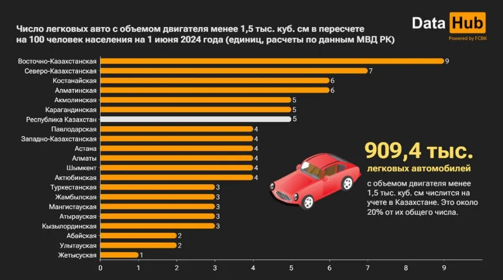 При этом, по данным МВД РК в начале лета 2024 года больше всего малолитражек зарегистрировано в Восточно-Казахстанской области. То есть, на каждые 100 человек приходится девять таких машин. На втором месте Северо-Казахстанская область – семь автомобилей на сотню жителей.
