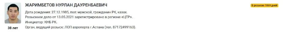 Нурлана Жаримбетова в Казахстане объявили в розыск почти три года.