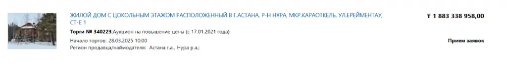 Дом Масимова выставили на торги впервые в феврале 2025 года. Желающих приобрести недвижимость не нашлось. Во второй раз особняк пытались продать в марте 2025 года. Стартовая цена осталась неизменной – 1,8 млрд тенге. Но на аукцион вновь не поступили заявки.