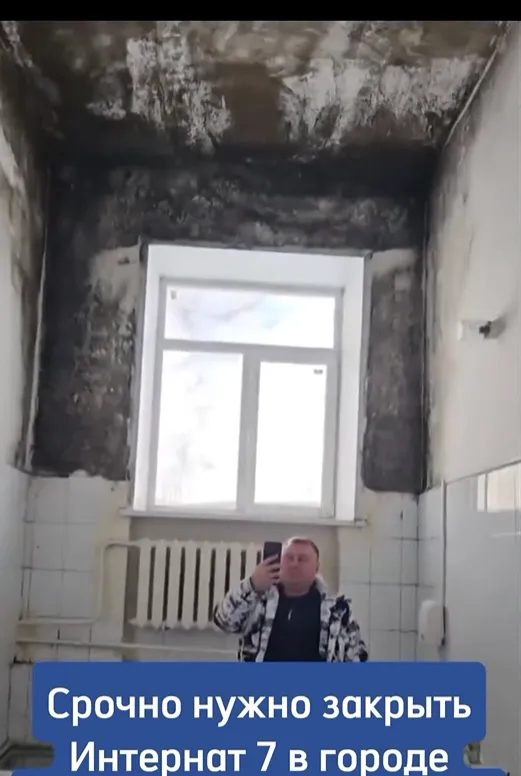 При дальнейшей инспекции она отметила, что «этой зимой в интернате возникла проблема с кровлей, когда были морозы». А проверяющий указывает на черный потолок в ванной комнате и говорит, что там «холодно как в карцере». Однако сотрудница утверждает, что раньше такого не было:
