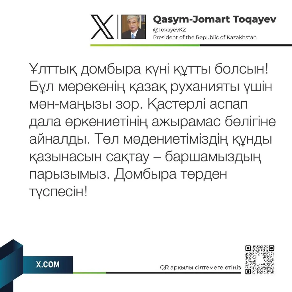 Поздравляю с Национальным днем домбры! Этот праздник имеет большое значение вР духовной жизни казахского народа. Домбра стала неотъемлемым элементом цивилизации Великой степи. Наш общий долг – сохранить это достояние казахской культуры. Пусть мелодия домбры звучит в каждом доме!, – написал глава государства.