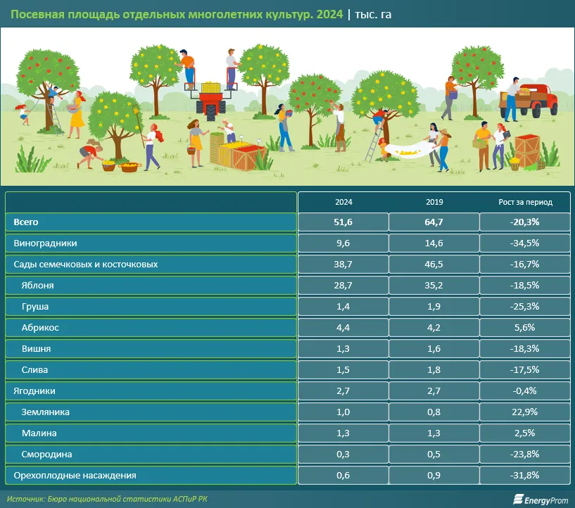 Аналитики Energyprom.kz подсчитали, что за последние годы площади садов и ягодников в Казахстане сократились на 20,3% - до 51,6 тыс. гектаров.
