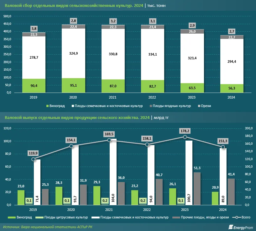 В 2024 году дела у казахстанских садоводов складывались не лучшим образом. Фермеры собрали самый низкий за последнее время урожай винограда, яблок, груш, вишни, слив и персиков. Это повлияло на то, что импорт фруктов в Казахстан вырос на десятки тысяч тонн по многим позициям.