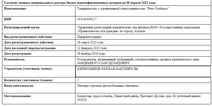 В конце марта 2022 года соучредителем в ТОО Petro Synthesis стал Нұржан Көпбосынов. Прошло чуть больше недели и все права на компанию передали родственнику Бозумбаева. Отметим, что той же весной нефтяное предприятие выиграло суд о взыскании 113 278 987 тенге задолженности, 2 001 779,36 тенге неустойки и 3 458 422,99 тенге госпошлины. Всего ТОО "Fox Invest" должно было 118 млн тенге за ранее предоставленные нефтепродукты.