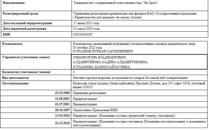- Игорь Ольхин . В сентябре 2023 года получил лицензию охотника. Она будет действительна следующие 20 лет. Кроме "Ski spirit", Ольхин значится учредителем в ТОО "Victory LTD ’а’ ", ТОО "Victory LTD" b и ТОО "Мерген KZ" (Оптовая торговля рыбой и рыбными продуктами). В последнем предприятии совладельцем выступает ещё и Владимир Шахворостов;