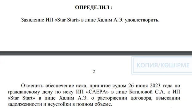 Во втором иске Саёре Баталовой тоже отказали (3 августа 2023 года), потому что Амин Халим не получила уведомление о расторжении контракта до 28 июня 2023 года. Дочери бывшего главы Алматинской области вернули 134 542 тенге госпошлины. Отметим, что после второго отказа Амине Халим сняли аресты с банковских счетов. Таким образом, несмотря на два отказа в суде, счета предпринимательницы были арестованы более двух месяцев.