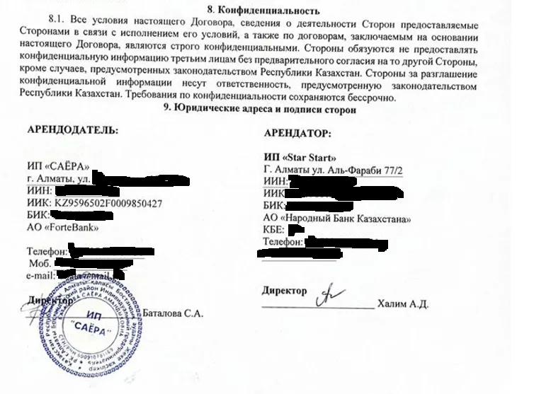 «Буквально через день Саёра Баталова сказала, что у неё есть дорогостоящий аппарат ICOONE и два косметических аппарата, которые работают по лицу. Они стоят где-то 60 – 65 тысяч долларов стоят. Нам предложили или купить их или взять в аренду. Мы решили арендовать оборудование. Одна процедура по телу с такими аппаратами обходится в 20-25 тысяч тенге. Аренда оборудования вошла в стоимость аренды помещения. Таким образом, последняя выросла до 1,5 млн тенге. Договор подписали дважды: на 200 тысяч тенге и на 1,5 млн тенге. Они не отменяли друг друга. Январь-февраль были каникулы из-за того, что надо было заниматься ремонтом помещения, закупом продукции и оборудования, потому что даже расчёсок не было. В марте за аренду Амина Халим заплатила 750 тысяч тенге, в апреле – миллион тенге. Кроме ремонта в первые два месяца мы проводили обучение и подбор персонала. Мы открылись официально в марте. Заказали дорогую вывеску. Потихоньку стали работать и расширять клиентскую базу. Мы перезаключили договор с охраной и другими поставщиками услуг»,