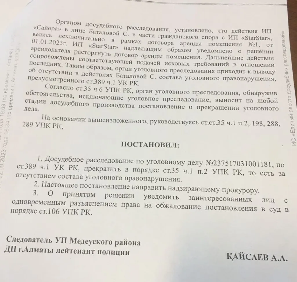 «Это всё бред. Есть факты, подтверждённые документально. Есть постановление о прекращении уголовного дела, есть постановление суда. Элеонора Халим, мать Амины, является конечным бенефициаром бизнеса. Она была в салоне, когда люди Саёры забирали оборудование. Это не пятиминутное дело, его разбирать надо минут 30. И сама Саёра Баталова его не забирала, она отправила людей. Элеонора Халим на очной ставке сказала, что была на месте. Более того, Халим ранее сама сказала: «забирайте оборудование, оно мне не нужно!» А насчёт двух договоров аренды: они в суде не смогли предоставить оригинал договора аренды на 200 тысяч тенге. Не было этого договора. Они ни копейки не платили. Оборудование не входило в договор аренды»,
