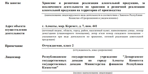 В 2011 году дочка экс-акима Алматинской области получила от департамента государственных доходов по городу Алматы лицензию на «хранение и розничную реализацию алкогольной продукции». Продавать товар она планировала в 441 помещении дома №7 в мкр. Керемет. Сейчас лицензия недействительна.