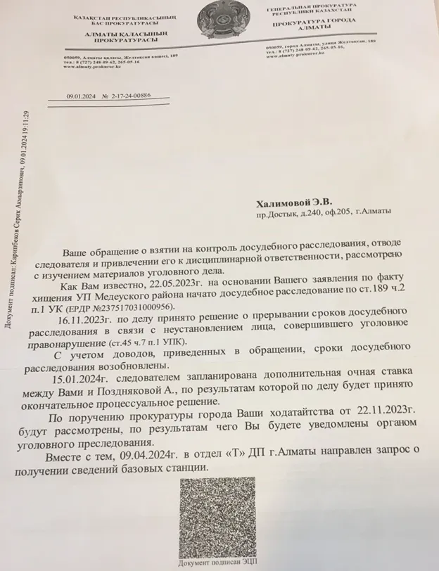 Что же касается дела по хищению вверенного имущества, то по нему до сих пор не приняли никакого решения. В начале января досудебное расследование возобновили, чуть позже назначили очную ставку между Аминой Халим и подозреваемой в хищении. Сумма ущерба составляет 1,6 млн тенге.