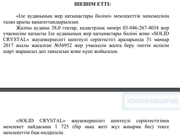 Через ТОО «SOLID CRYSТAL» Саёра Баталова до недавнего времени арендовала 38 гектаров земли в Илийском районе Алматинской области. Договор представители предприятия и отдел земельных отношений Илийского района заключили ещё 31 мая 2017 года. Но весной 2023 года акимат решил аннулировать контракт. Удалось это только 1 декабря 2023 года. Специализированный межрайонный экономический суд Алматинской области отменил договор аренды и поставил выплатить ТОО «SOLID CRYSТAL» 1725 тенге в виде госпошлины.