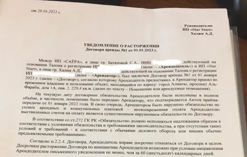 «На письменное уведомление Саёра Баталова не отреагировала, но устно сказала, чтобы мы использовали первый договор аренды на 200 тысяч тенге. Никакого нового документа не подписывали, всё было голословно. Она просто отмахнулась. С этого момента началась борьба за расторжение договора. Саёра Баталова подала иск в Специализированный межрайонный экономический суд Алматы с просьбой расторгнуть договор аренды, взыскать задолженность и неустойку. Там за апрель был миллион тенге, 1,5 млн тенге – за май и т.д. Судья сразу наложил арест на все счета Амины Халим. Она не могла работать с мая. До этого моя клиентка регулярно платила за аренду без каких-либо проблем»,