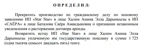 По первому иску дочери экс-акима 9 июня 2023 года в суде прекратили производство, потому что не прошёл срок в 60 календарных дней с момента уведомления о расторжении договора.