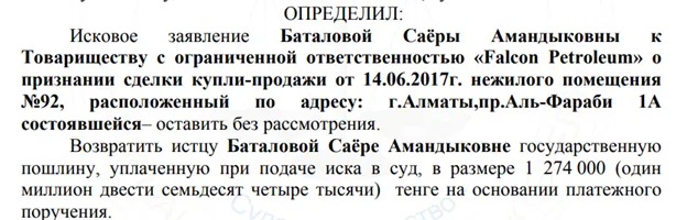 Осенью 2019 года дочери экс-акима пришлось судиться с Falcon Petroleum за этот участок. 22 октября 2019 года Медеуский районный суд Алматы оставил без рассмотрения иск Баталовой о признании сделки купли-продажи состоявшейся.