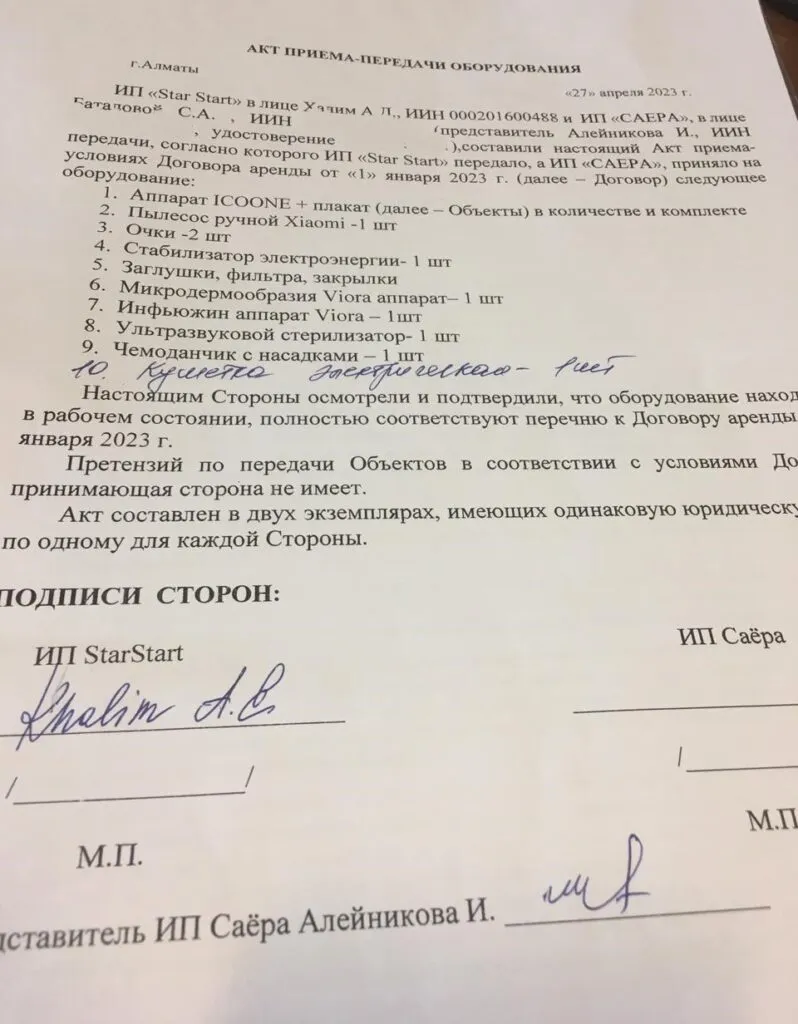 «27 апреля 2023 года Саёра Баталова пришла в офис. Не предупредив заранее, она решила забрать то самое оборудование, которое сдала нам в аренду (Аппарат ICOONE, Аппарат микродермообразия Viora и инфьюжин аппарат Viora). В тот же день она потребовала, чтобы мы показали ей аккаунты в приложении Zapis.kz (сервис онлайн-записи) и Instagram. Ранее это были её аккаунты, мы их взяли, чтобы не раскручивать новые. По её требованию сервис онлайн-записи отключили. На следующий день Баталова назначила встречу. В это время Амина Халим была в Ташкенте на операции, естественно, она не могла присутствовать. От её лица были другие люди. Юристы Баталовой предоставили договор о расторжении. Причиной указали несвоевременную оплату арендных и коммунальных платежей. Хотя мы регулярно платили за аренду без просрочек (платёжки есть в распоряжении редакции – Прим. Ред.). Они хотели забрать уже действующий, рабочий бизнес. В течение двух месяцев вся семья Баталовой обслуживалась в этом салоне: родители, дети, сестры и братья. Уведомление о расторжении должно было вступить в силу в течение 60 дней»,