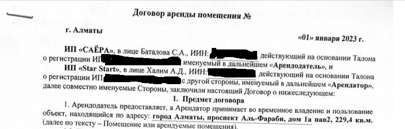 «В ноябре мама Элеонора Халим познакомилась с Саёрой Баталовой, которая и предложила своё помещение для аренды под салон красоты. К этому времени мы уже осмотрели несколько вариантов, но они нам не понравились. При встрече Саёра несколько раз говорила, что она дочь экс-акима Алматинской области. Она сказала, что сейчас ей неинтересно заниматься бизнесом, и она хочет заняться воспитанием детей. Я хотела заключить договор в декабре 2021 года, потому что это самый горячий месяц, но Баталова попросила об отсрочке. У работающих сотрудниц были записи до конца года. Я согласилась подписать договор с 1 января на сумму 200 тысяч тенге. Но из-за того, что январь – февраль –"мёртвые месяцы", мы попросили о льготном периоде. В договоре это указали»,