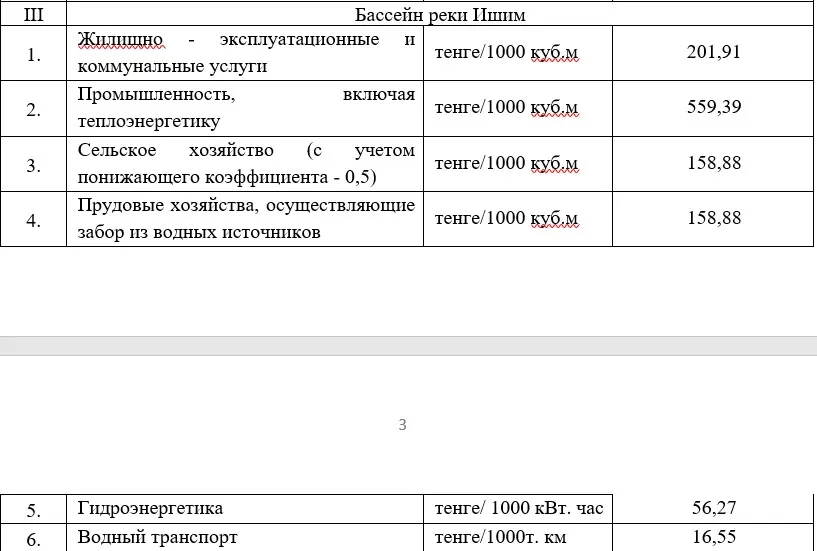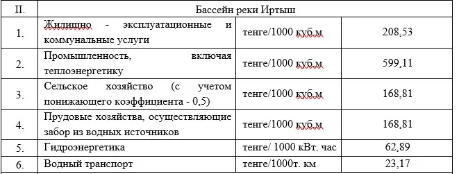 В опубликованном документе описаны тарифы на следующие бассейны рек и озёр: Балхаш, Алаколь, Иртыш, Ишим, Нура, Сарысу, Кенгир, Тургай, Тобол, Иргиз.