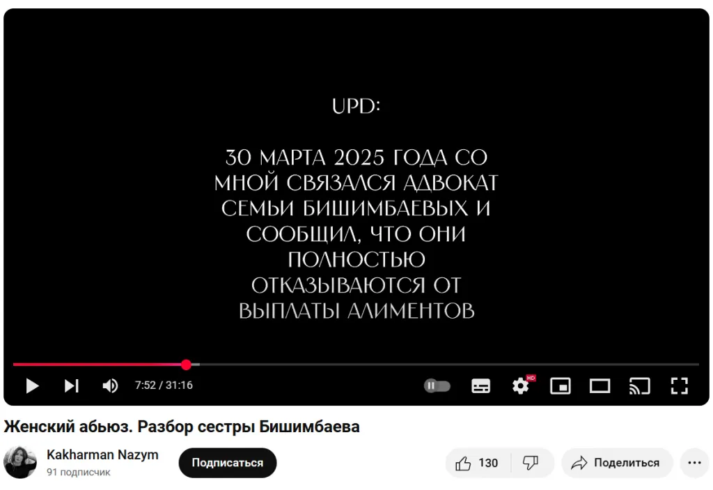 После этого на экране появилась надпись «30 марта со мной связался адвокат семьи Бишимбаева и сказали, что они полностью отказываются от выплаты алиментов».