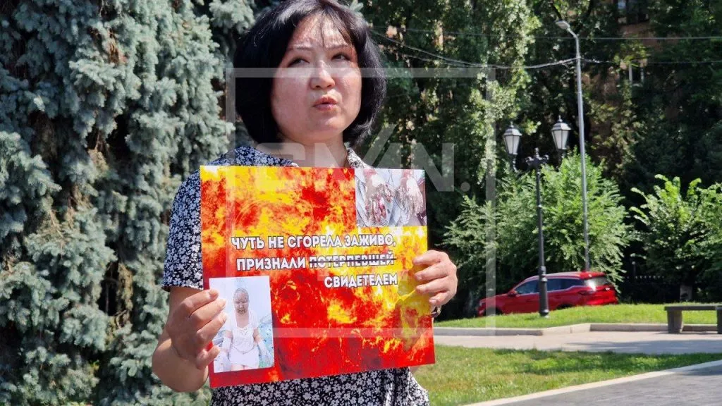 Пикет Тергеубаевой прошёл в сквере имени Ш. Уалиханова в Алматы. Женщина вышла с плакатом «Чуть не сгорела заживо, признали свидетелем» и требовала от властей признать её потерпевшей в деле о халатности полиции.