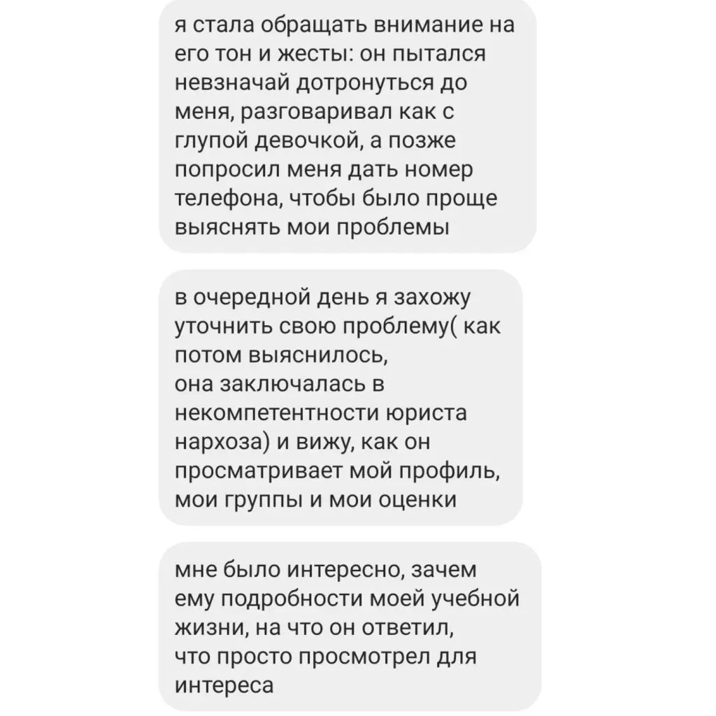 }}«Мне стало очень противно и обидно, потому что это, как минимум, неэтично, что сотрудник деканата подкатывает к девушкам во время работы, пока они обращаются к нему за помощью. И при этом он имеет полный доступ к личным данным студенток для своей выгоды».