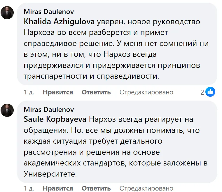 Комментаторы посоветовали Фатиме обратиться в суд, а Дауленов ответил на своё упоминание в диалоге, уверенным заявлением, что нынешнее руководство Нархоза самостоятельно решит эту проблему: