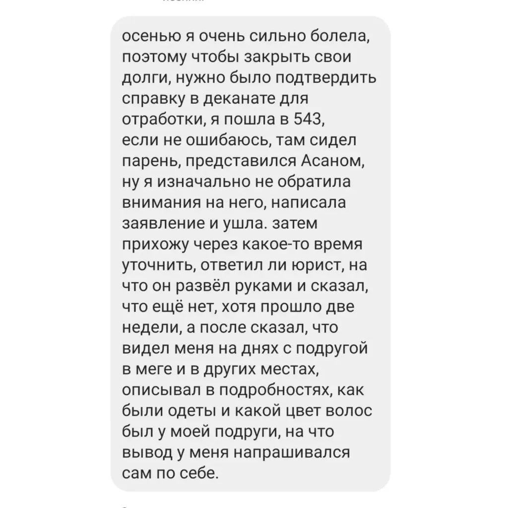 Тогда Фатима сама пошла напрямую в деканат. Где её встретил помощник декана — студент-старшекурсник. Но вместо того, чтобы проблему решить, он начал пользуясь рабочим положением “подкатывать” к девушке.