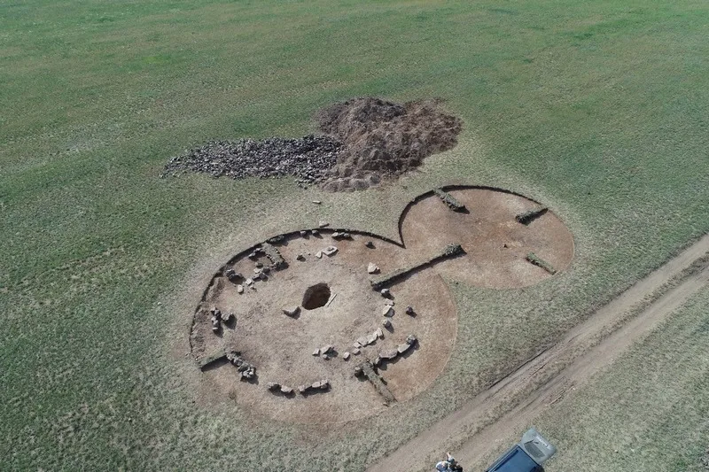 Археологи продолжают изучать на могильнике Аккезен курган "с усами". Это сооружение состоит из головного кургана и двух курганов-спутников. От них на восток отходят две дугообразные каменные выкладки. Заканчиваются они небольшими каменными насыпями.