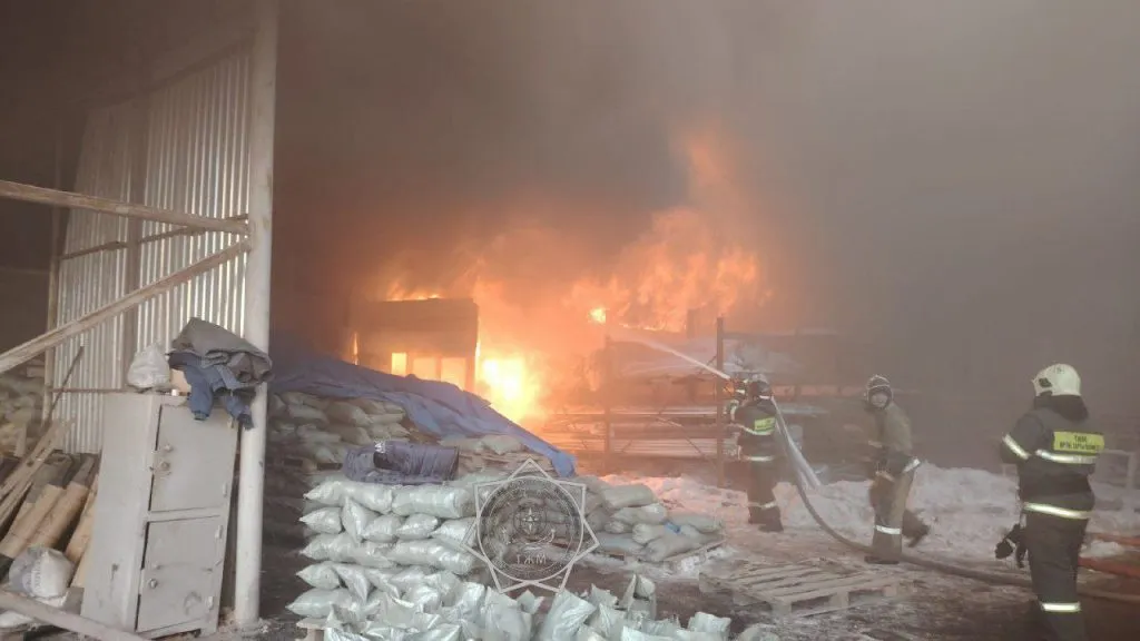 Днём 14 января на одном из складов магазина строительных материалов в Каскелене вспыхнул пожар. Спасатели МЧС РК пытаются справиться огнём уже больше часа.