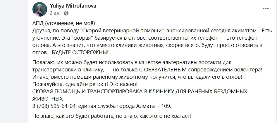 Но в соцсетях сразу выразили сомнения в работе службы "ветеринарной скорой помощи" из-за того, что для вызова был указан номер телефона 8 708 595 64 04. Это контакт службы отлова, к которой у общественности неоднозначное отношение.