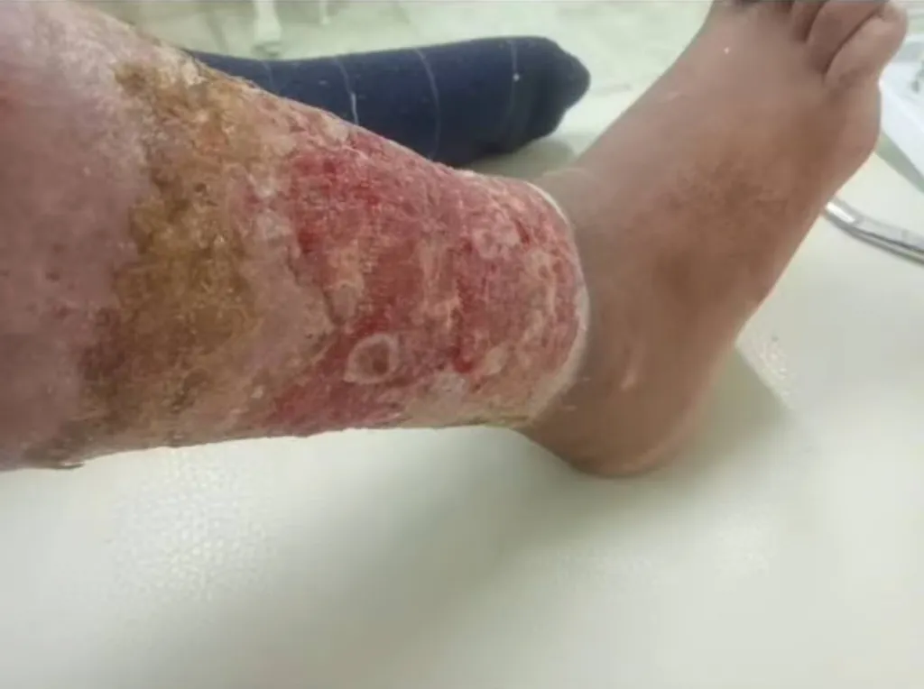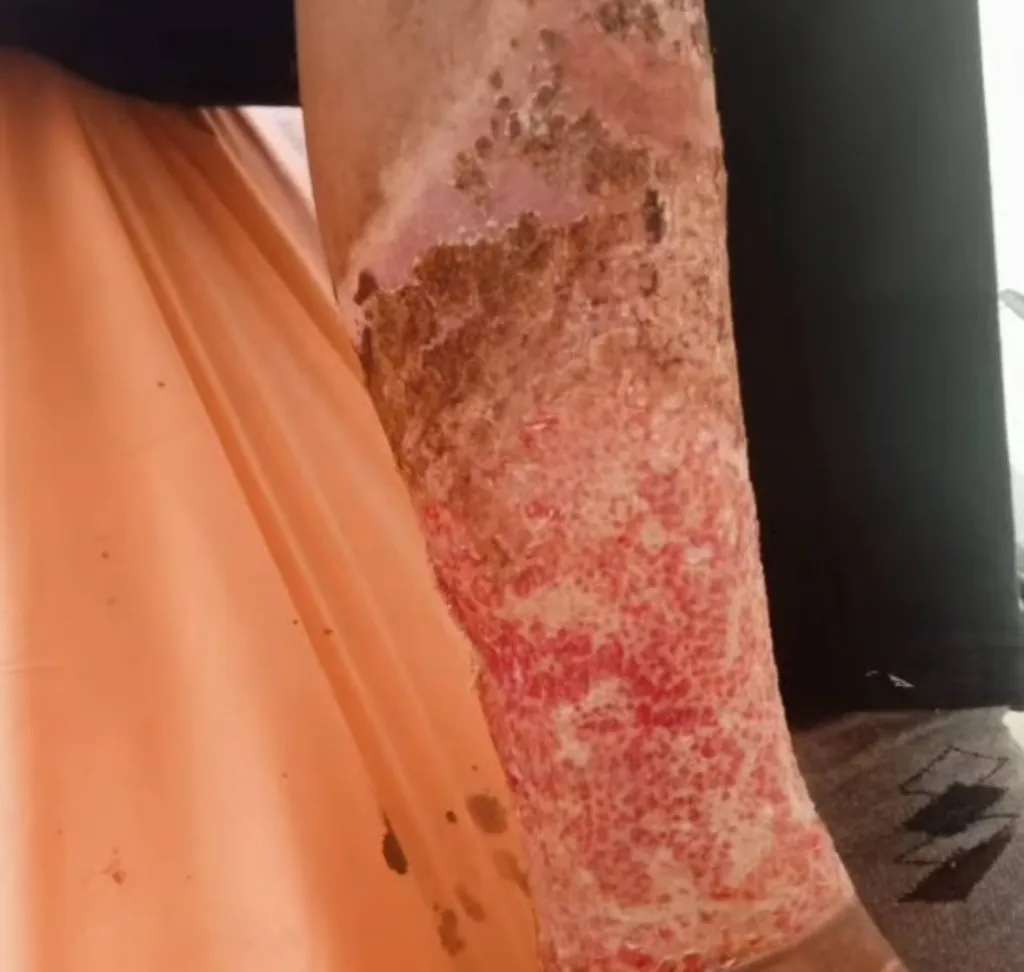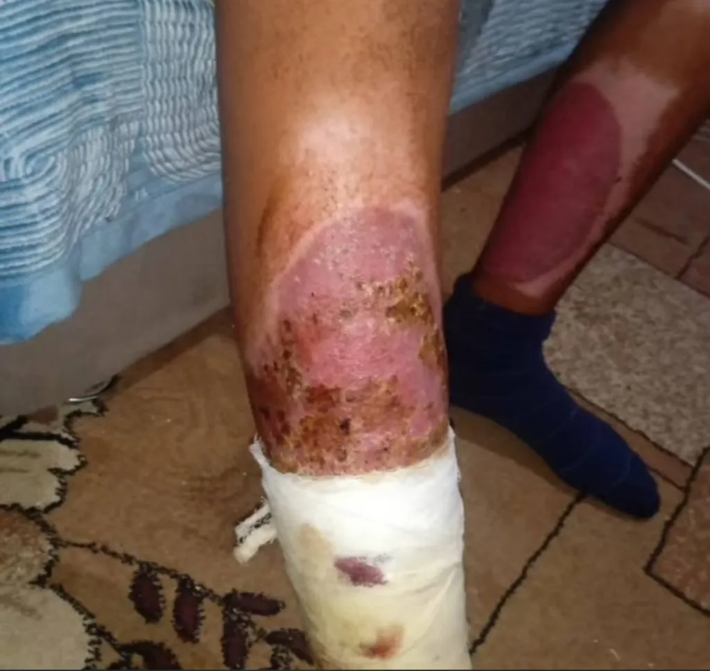 Горящий ребёнок в панике начал срывать с себя одежду. Однако расплавившаяся ткань уже успела прилипнуть к коже ног. В ужасе он содрал штаны вместе с кожей.