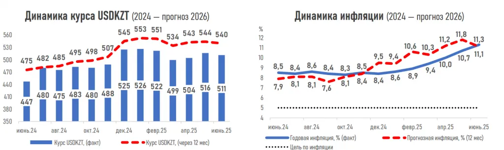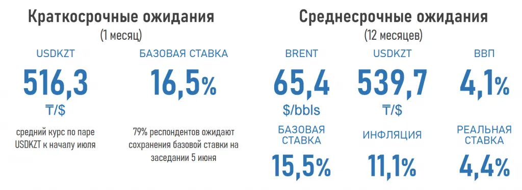 Однако ожидания по курсу через год немного улучшились – до 539,7 тенге за доллар с 543,9 тенге. Этому способствовали более высокие прогнозы по ценам на нефть, снижение инфляционных ожиданий, ожидаемого улучшения процентного дифференциала в пользу тенговых активов.